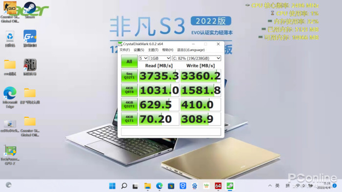 同時,我們也對固態硬盤進行了測試。在CDM測試中,我們可以看到這塊固態硬盤的順序讀取速度為3735.3MB/s,順序寫入速度為3360.2MB/s。從數據上來看,這塊運行在PCIe4.0規范的固態硬盤,并不會制約處理器的發揮,能夠有效保證運行效率。