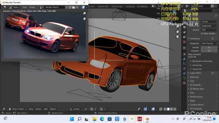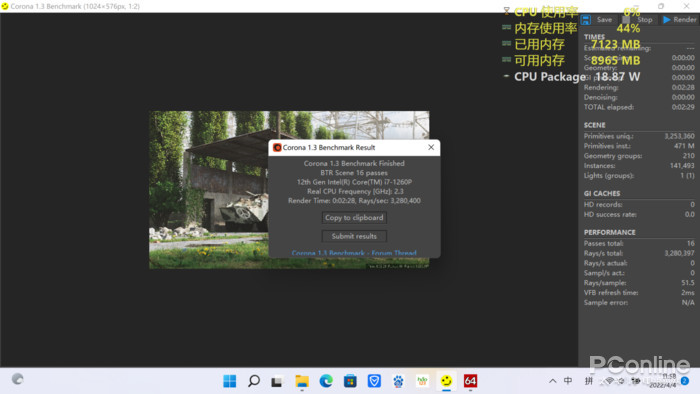 首先是Corona1.3,完成BenchMark耗時2分28秒,這甚至已經和某些設置了功耗墻的高性能筆記本差別不大。