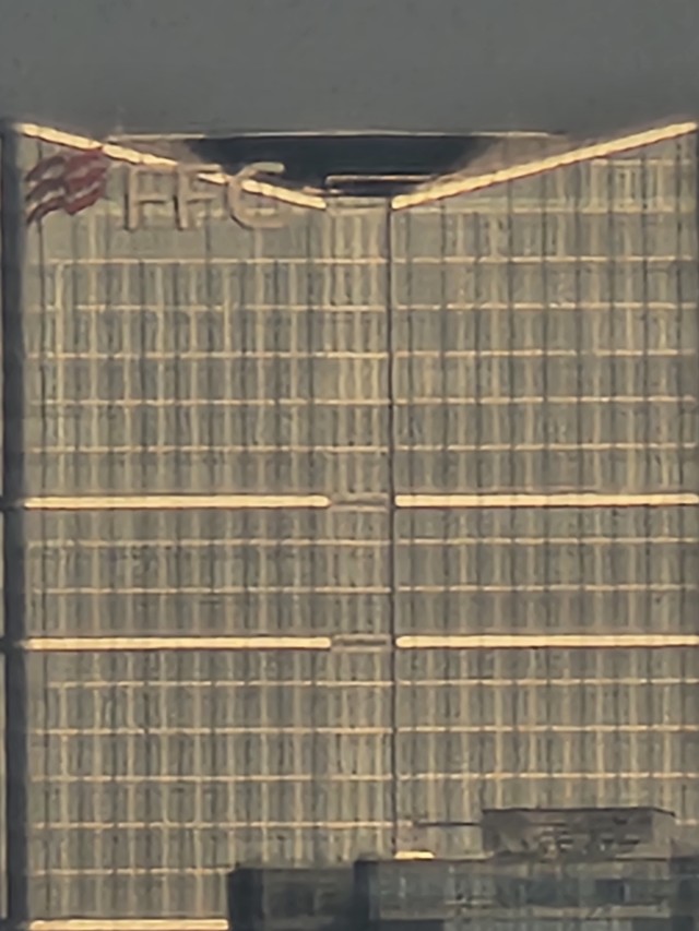 兩個(gè)手機(jī)的畫幅還是有比較大的區(qū)別的,就以畫面右下角的樓房對(duì)比,iPhone 13 Pro Max拍出的樓房基本一片灰白,三星Galaxy S22 Ultra比較寫實(shí)。在開啟后者的100X變焦后,甚至能看清遠(yuǎn)處FFC大樓的標(biāo)牌。