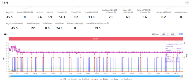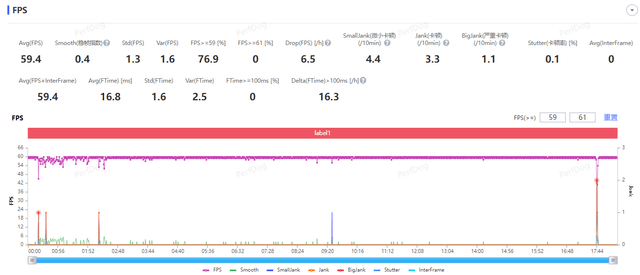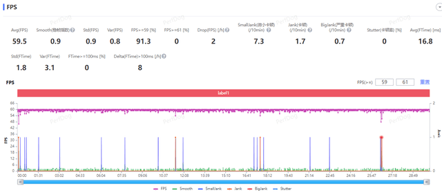 從實際游戲表現來看,iPhone14 Pro跑30分鐘《原神》,平均幀率為59.5fps,91.3%的時間可以穩定在59fps以上,整個游戲過程中,超過一幀的波動很少,游戲全程還是非常穩的。