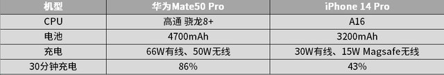 再來說說續航,華為Mate50 Pro搭載了4700mAh電池與66W有線快充及50W無線快充的組合,在旗艦陣營中屬于比較均衡的配置。反觀iPhone 14 Pro的電池僅3200mAh,支持30W有線充電以及15W MagSafe無線充電,二者的差距還是相當懸殊的。