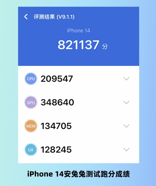 在基準性能測試中,我們發現iPhone 14可以像預期的那樣,在新的散熱配置下充分釋放A15處理器的性能。在安兔兔V9測試中,iPhone 14取得了821.137萬的優異成績,比搭載iPhone 13同款“殘血版”A15處理器但散熱性能出色的iPhone SE 3高出約12%。并且通過對比分項得分,可以發現iPhone 14在CPU、GPU、存儲方面的性能都有所提升。這些成績一方面得益于A15滿血處理器核心性能的升級,另一方面iPhone 14的RAM升級到了6GB LPDDR4X的規格。