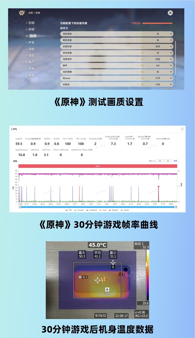 最后,我們還進行了知名手機性能測試游戲《原神》的重載測試。我們將畫質選項設置為極高畫質+60幀,測試場景為李月剛跑分圖。iPhone 14 30分鐘游戲實測平均幀率為59.5幀,幀率曲線波動極小,全程無明顯降幀現象。游戲的畫質相當不錯。《原神》經過30分鐘的重載測試后,我們測量了iPhone 14后蓋的溫度。實測溫度平均45攝氏度,在同類車型中屬于正常表現。這也說明iPhone 14新加入的散熱配置起到了一定的作用。