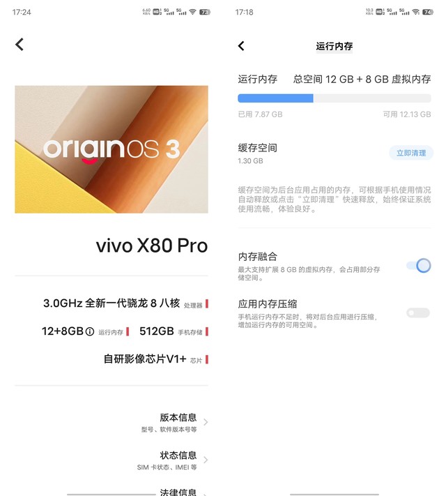 以我手中的這臺12GB+512GB內存版本的vivo X80 Pro為例,可以實現12G內存+8G的運存效果,從而可以大幅提升后臺運用的存活情況。